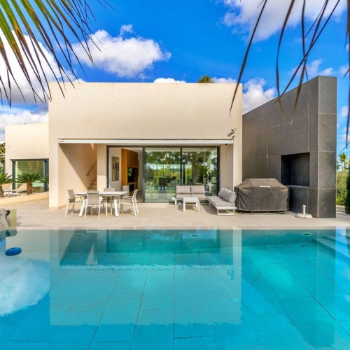 En exklusiv villa med 6 sovrum i det prestigefyllda Madroño-området i Las Colinas Golf & Country Club. Belägen på en privat tomt med imponerande golfutsikt erbjuder den modern arkitektur, högkvalitativa material och en sömlös inomhus–utomhus livsstil.~~Villan har sex rymliga sovrum, fyra badrum och en gästtoalett. Det öppna vardagsrummet ansluter till det moderna köket och till den stora terrassen med infinity-pool och utsikt över naturen.~~Källarplanet inkluderar biografrum, gym och ett flexibelt utrymme med möjlighet att skapa ytterligare ett sovrum, kontor eller studio.~~Boende får tillgång till 24-timmars säkerhet, fullständig integritet, gourmetrestauranger, sportanläggningar, naturstigar och en av Europas bästa golfbanor.