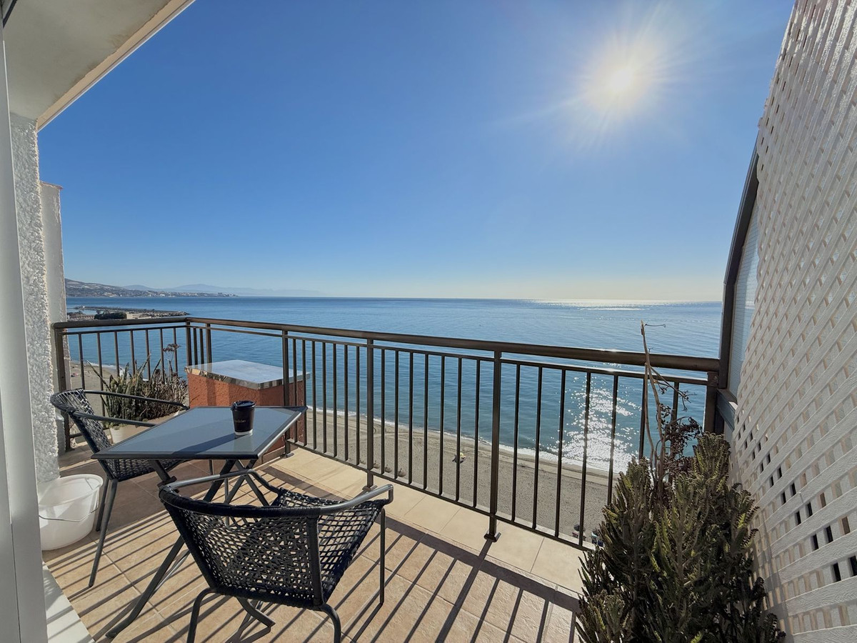 Lägenheten har två rymliga sovrum och ett fullt renoverat, modernt badrum (ej en-suite). Det öppna köket är fullt utrustat och integrerat med det ljusa vardagsrum–matrummet, som har direkt utgång till en frontterrass mot havet – den perfekta platsen för att njuta av oförglömliga soluppgångar över havet.