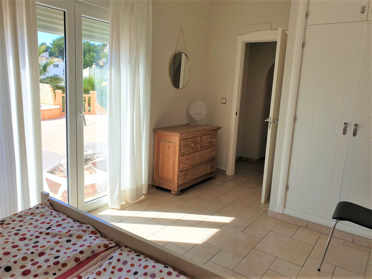 Villa in Jávea, with a built area of 152.00m2. A short distance from all services. In the villa, we find a living-dining room with a wood-burning fireplace and a beautiful fully equipped open kitchen. An entrance hall leads to a large covered naya, which in turn has access to the pool terraces. The sleeping area consists of two spacious bedrooms, one of them with an en-suite bathroom and direct access to the terrace and pool. Going up a spiral staircase, we come to a circular bedroom in the center of the tower with built-in wardrobes, a dressing room, an en-suite bathroom, and access to a private terrace. The villa features PVC double glazing, underfloor heating, cold/heat air conditioning, a 10,000-liter water tank, and a 10 x 5m pool with a Jacuzzi surrounded by terraces.