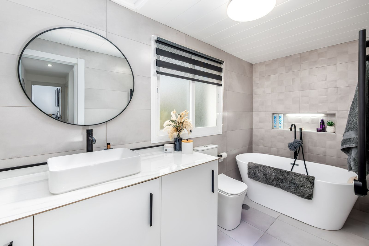This move in ready property comprises of a large, open plan kitchen-living-dining floor leading to a bright and warm, covered, dining and lounge terrace with south to southwest facing views overlooking the mountain range of Alhaurín Golf, Barranco Blanco and beyond.