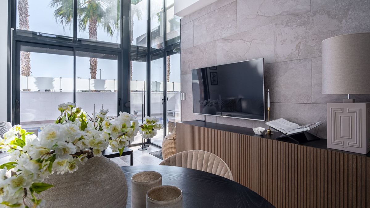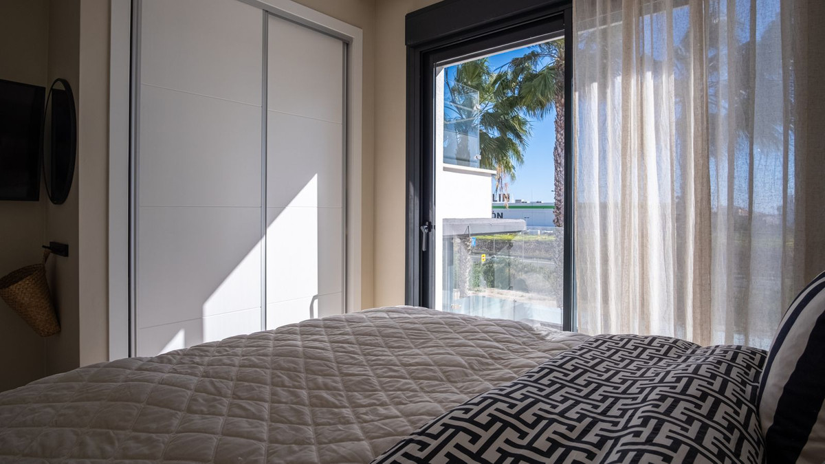 Med två våningar och 128 m² omsorgsfullt designade interiörer, är detta hem översvämmat av naturligt ljus. Den öppna planlösningen med vardagsrum och matplats ansluter sömlöst till ett fullt utrustat modernt kök, vilket skapar en inbjudande plats för vardagsliv eller att underhålla gäster. Villan har tre generösa sovrum, varav två har lyxiga badrum, alla med inbyggda garderober och stora fönster som förstärker den ljusa, luftiga atmosfären.