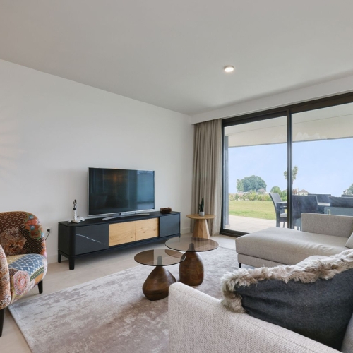 The apartment features a bright and spacious living-dining area opening directly onto the expansive garden, ideal for outdoor living and enjoying the Mediterranean climate. It offers three well-proportioned bedrooms and two bathrooms, with built-in wardrobes and air conditioning, ensuring year-round comfort.