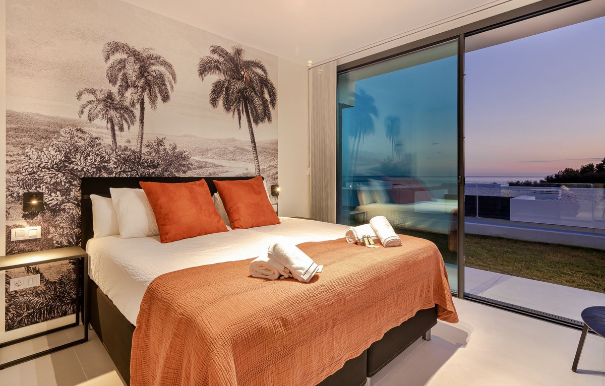 The upper level is dedicated entirely to the master suite, featuring an en-suite bathroom and a private terrace with panoramic sea views.