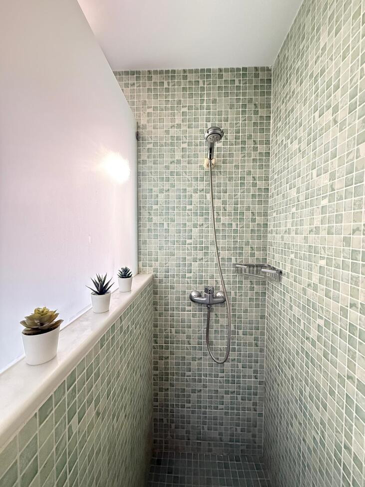 On the ground floor, a bright and spacious living-dining room with air conditioning opens directly onto a private porch and garden, creating a seamless indoor-outdoor space ideal for family life and entertaining. The modern, fully renovated kitchen offers generous storage and high-quality appliances. This level also features a stylish bathroom with walk-in shower, a practical laundry and pantry area, a double bedroom with fitted wardrobe and air conditioning, and an outdoor storage room with independent access.