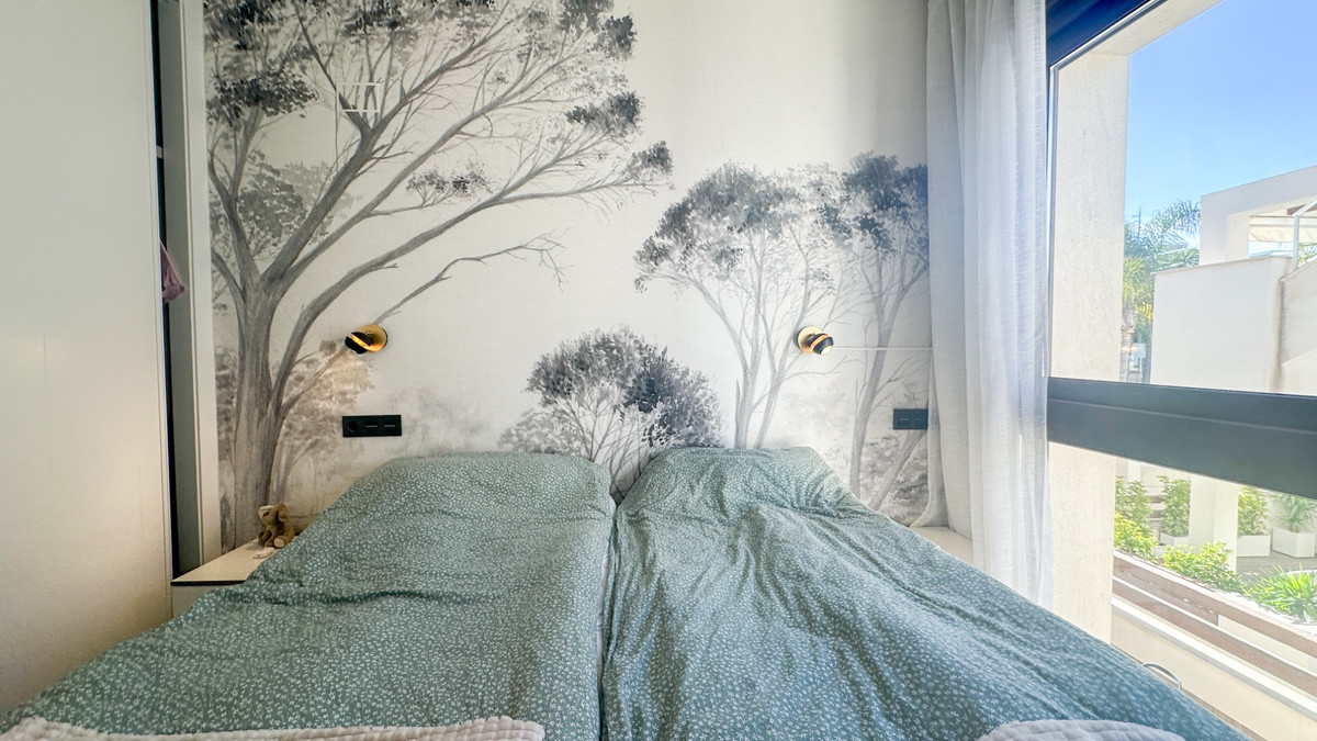 Bostaden erbjuder tre rymliga sovrum och två moderna badrum, utformade för hög komfort och funktionalitet. Interiören har en modern design med öppna ytor, ljusa rum och högkvalitativa materialval.