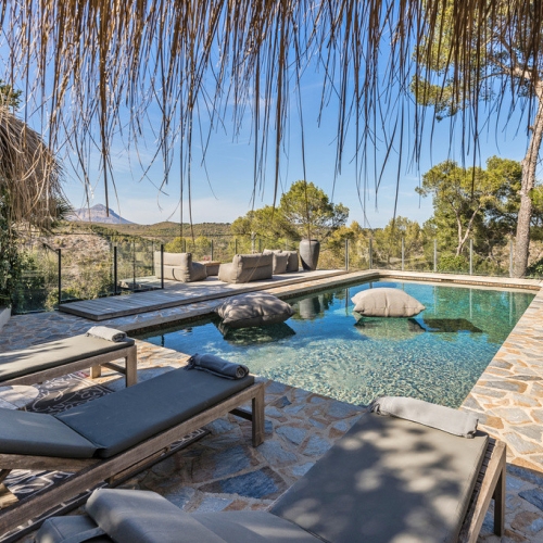 Fascinating villa of exquisite good taste with a beautiful terrace and pool, two living rooms, a wine cellar, a gym, an office area, a sauna, an alarm system, and home automation.