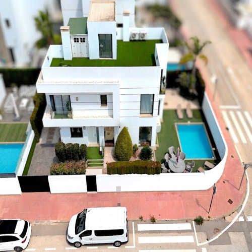 Outdoor areaThe villa is set on a south facing plot of 546 sqm. It has a lovely tiled garden where you can find a swimming pool and a lot of space for outdoor seating areas and sun beds. By the entrance there is also a large covered terrace. At the back of the house there is a large parking area with space for several cars. The villa also has a large terrace in the first floor with amazing views over the salt lakes and Torrevieja.