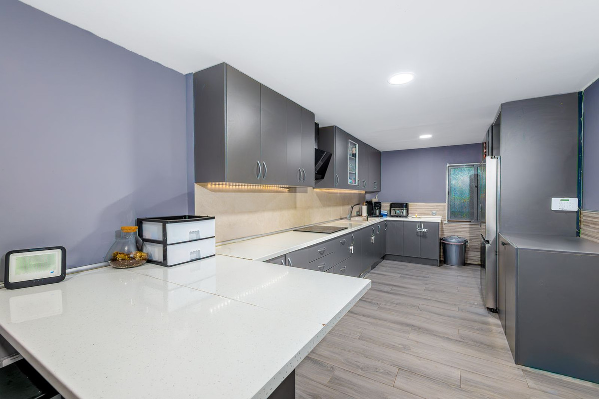 The bright and spacious open-plan living and dining area flows seamlessly into the refurbished kitchen, creating a contemporary and welcoming atmosphere — ideal for family living or entertaining guests.