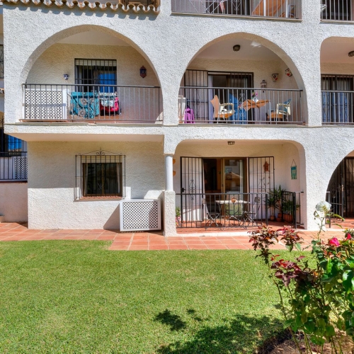 Denna exklusiva lyxlägenhet är belägen i det attraktiva området Miraflores i Mijas Costa, Malaga. Med 2 sovrum och 2 badrum, varav ett är en-suite, erbjuder bostaden generösa ytor med 104,9 m² interiör och en rymlig terrass på 33,29 m². Fastigheten har en total byggyta på 138,19 m² och ingår i en välskött och säker, inhägnad anläggning med gemensam pool, trädgård och garage.