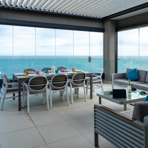 Lägenheten har renoverats med stor omsorg och erbjuder moderna detaljer i hela bostaden. Det rymliga vardagsrummet med öppen planlösning är fyllt med naturligt ljus och skapar en inbjudande atmosfär. Det moderna köket är fullt utrustat med högkvalitativa apparater, perfekt för att laga måltider som kan avnjutas i det intilliggande matutrymmet eller på den privata terrassen med utsikt över havet.