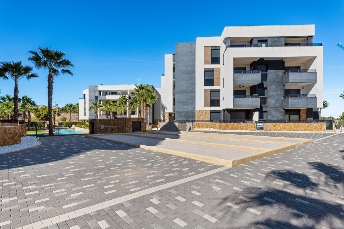 We present to you a beautiful and new 2 bedroom apartment in the popular Amanecer VI gated complex in Los Altos. The property with southwest exposure, located on the second floor with elevator, equipped with high quality furniture, modern household appliances, air conditioning and underground parking with storage room.The apartment consists of a bright living room with dining area, open kitchen and two double bedrooms with built-in wardrobes. The master bedroom has an en suite bathroom and both bathrooms have underfloor heating. The balcony overlooking the communal pool and garden invites you to relax outdoors.Residencial Amanecer VI offers a safe and quiet environment with large green areas, boules courts and water attractions.  Ideally located 750 m from a supermarket and a few minutes walk from the restaurants and bars of Via Park III, just a 10 minute drive from the beaches, Zenia Boulevard and world class golf courses such as Villamartin and Las Ramblas.Ready to move in!