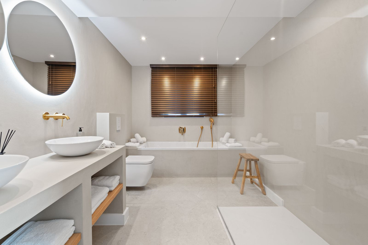 The villa offers 4 spacious bedrooms, each with its own ensuite bathroom, as well as two guest toilets. The master suite occupies the upper level and features a private terrace with spectacular sea views.