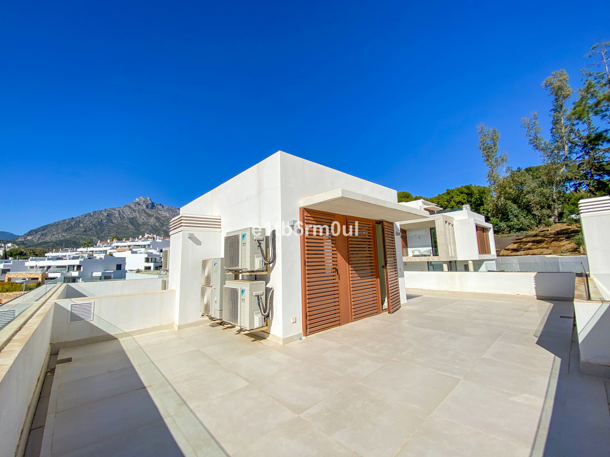 New semi detached villa in the heart of the Golden Mile, Marbella only 300m from the beach and the Puente Romano. Five-minute drive from Marbella Centre and Puerto Banus. 24-hour security communal pool, gym and spa. Perfect opportunity to own a three bed ( 4th in the basement ) three bath, brand new semi-detached house with private plunge pool. Open plan kitchen, living room leading out to private garden on the ground floor with guest WC. 1st floor hosts three bedrooms , one en-suite, two sharing a bathroom. On the 2nd floor a magnificent solarium with views to the concha mountain. Basement floor living room, 4th bedroom and bathroom. Two car parking spaces with direct access to the house and storage space are also included.