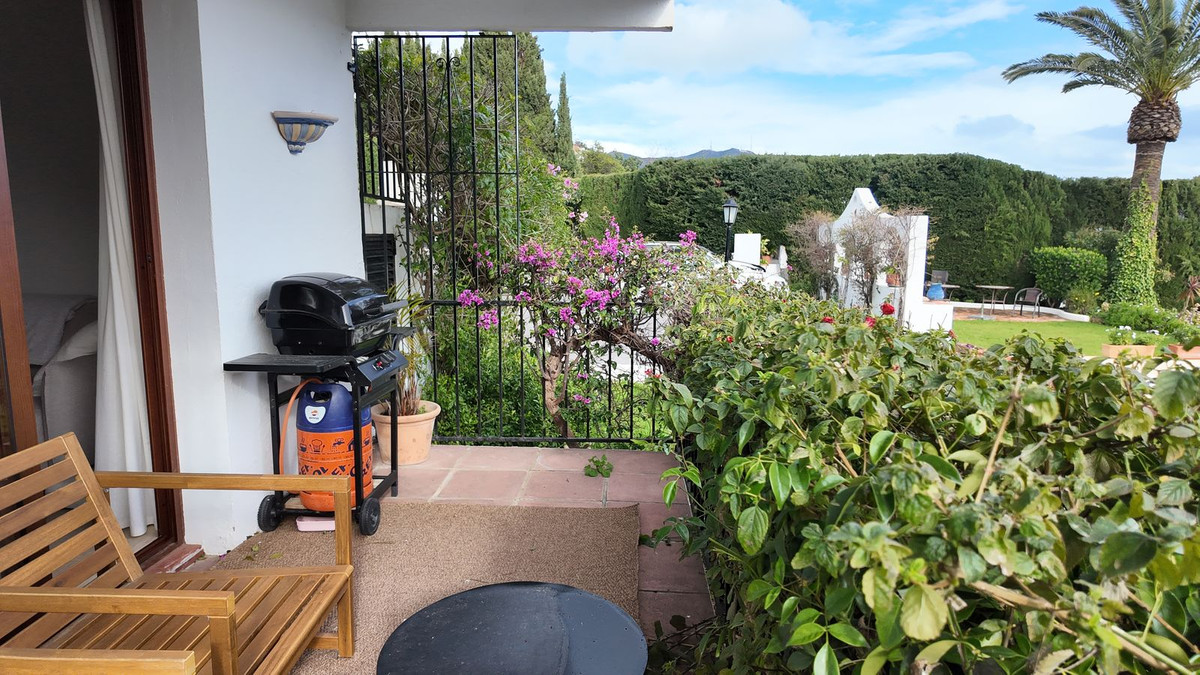 Bostaden erbjuder två välplanerade sovrum, varav det ena är ett master bedroom med eget badrum (en suite), ytterligare ett badrum samt ett ljust och rymligt vardagsrum med generöst ljusinsläpp. Från vardagsrummet har du delvis havsutsikt och direkt access till de vackert skötta gemensamma trädgårdarna, vilket skapar en harmonisk övergång mellan inne- och utemiljö.