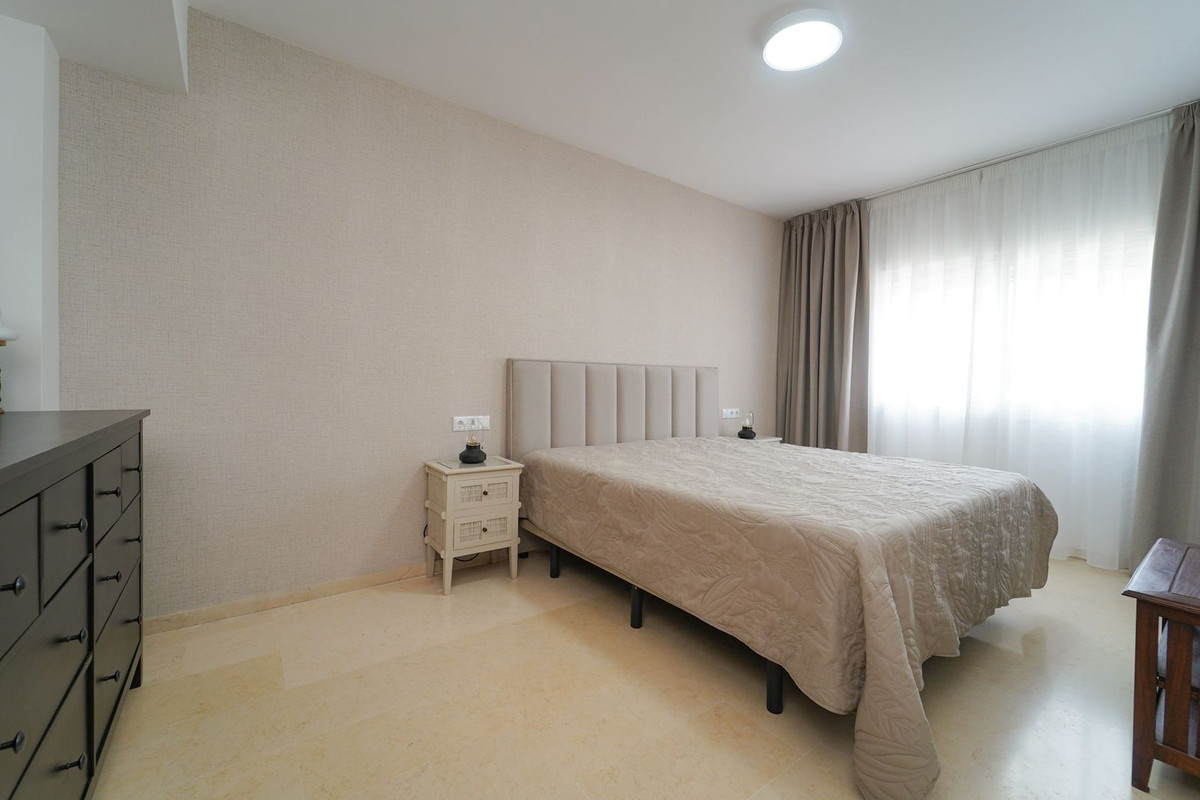 Bright and recently renovated 123 m² penthouse in the quiet area of Elviria, Marbella. The property offers two large bedrooms, two spacious bathrooms, a bright living area, fully equipped kitchen, and a private terrace with side sea and forest views. Features include window blinds and an electric awning. Located in a well-maintained complex with six swimming pools and lush gardens. Includes underground parking. Sold furnished.
