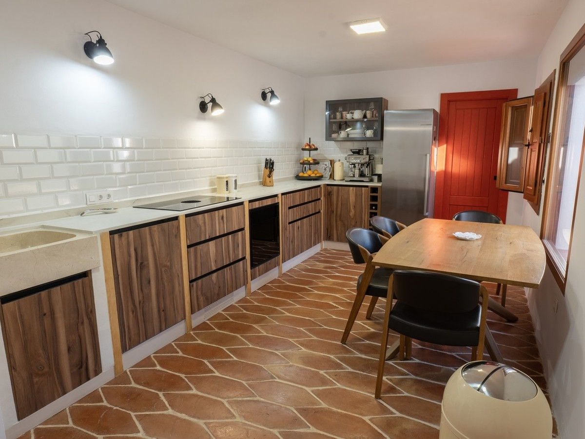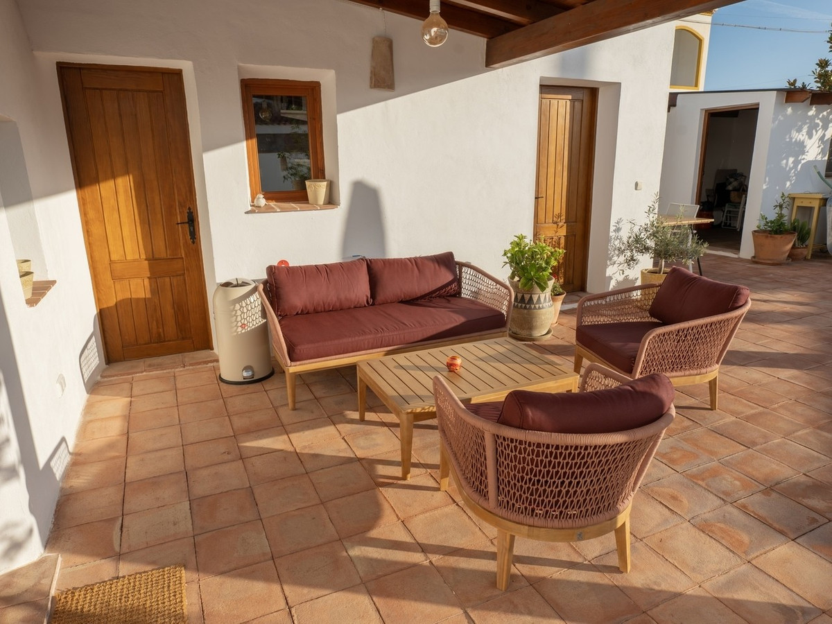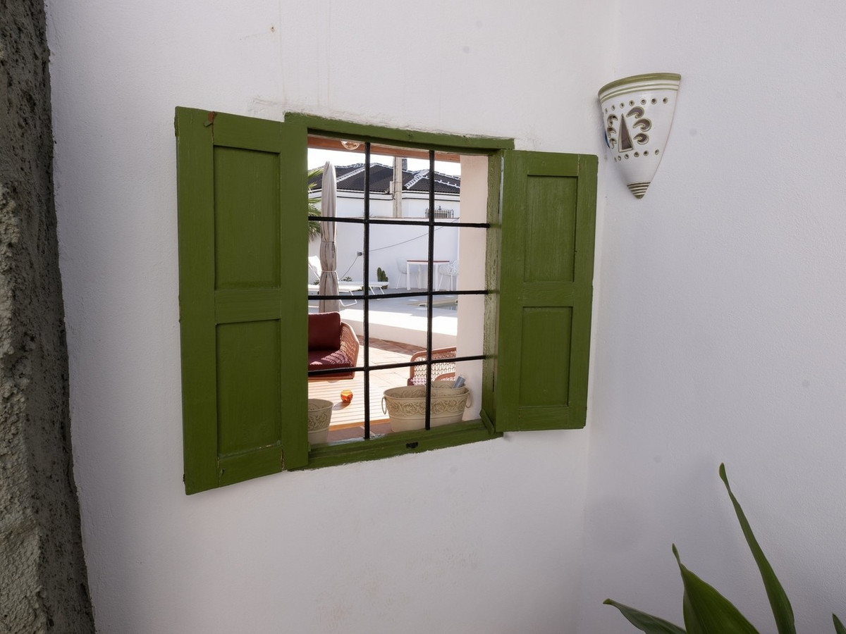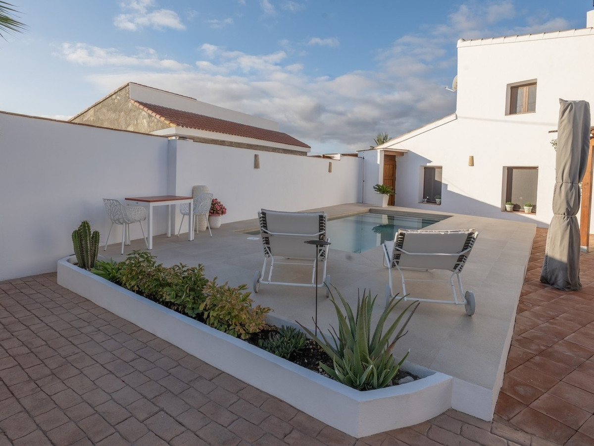 The house retains distinctive Andalusian features including thick whitewashed walls, an original entrance hall, landscaped courtyards, and handcrafted natural materials that create a timeless and warm atmosphere. With a built area of 237 square metres and a plot size of 438 square metres, the property is designed around a central landscaped courtyard that serves as the heart of the home. Here you will find a private swimming pool, generous porch, and outdoor kitchen with fireplace, perfect for enjoying al fresco dining.