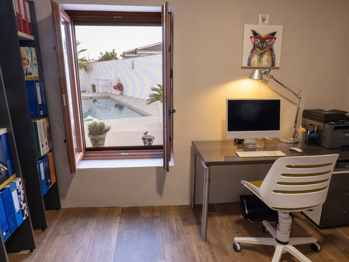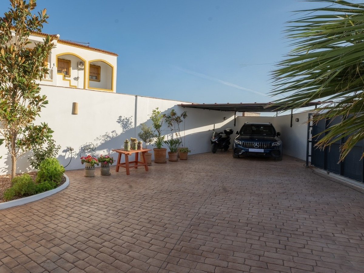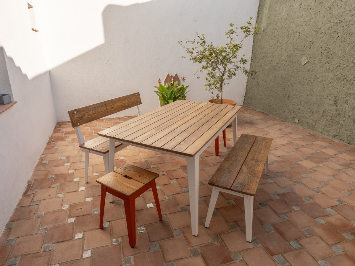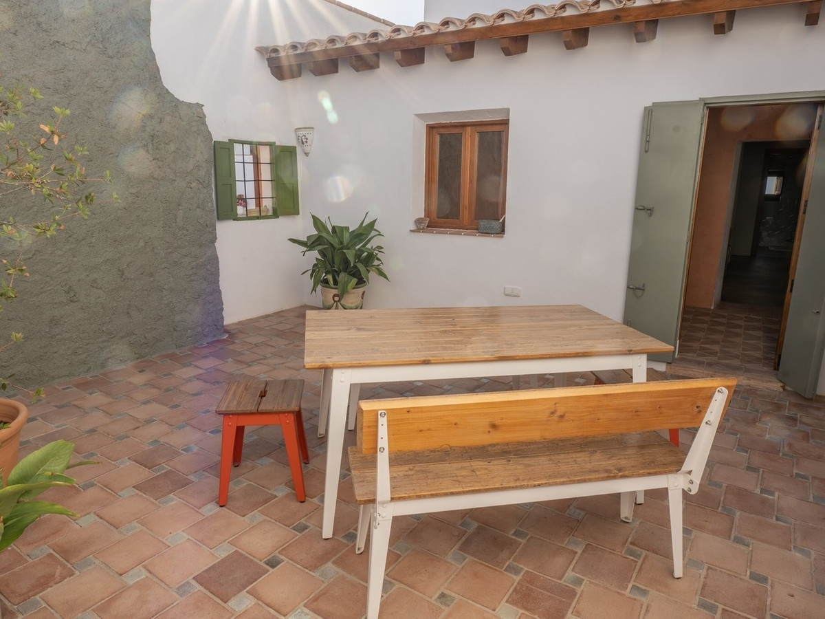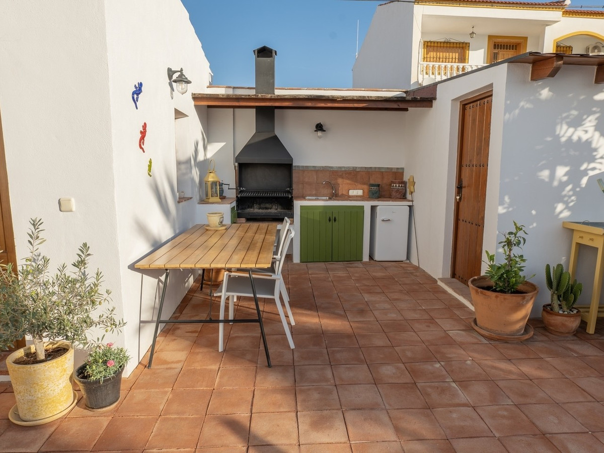 The house retains distinctive Andalusian features including thick whitewashed walls, an original entrance hall, landscaped courtyards, and handcrafted natural materials that create a timeless and warm atmosphere. With a built area of 237 square metres and a plot size of 438 square metres, the property is designed around a central landscaped courtyard that serves as the heart of the home. Here you will find a private swimming pool, generous porch, and outdoor kitchen with fireplace, perfect for enjoying al fresco dining.