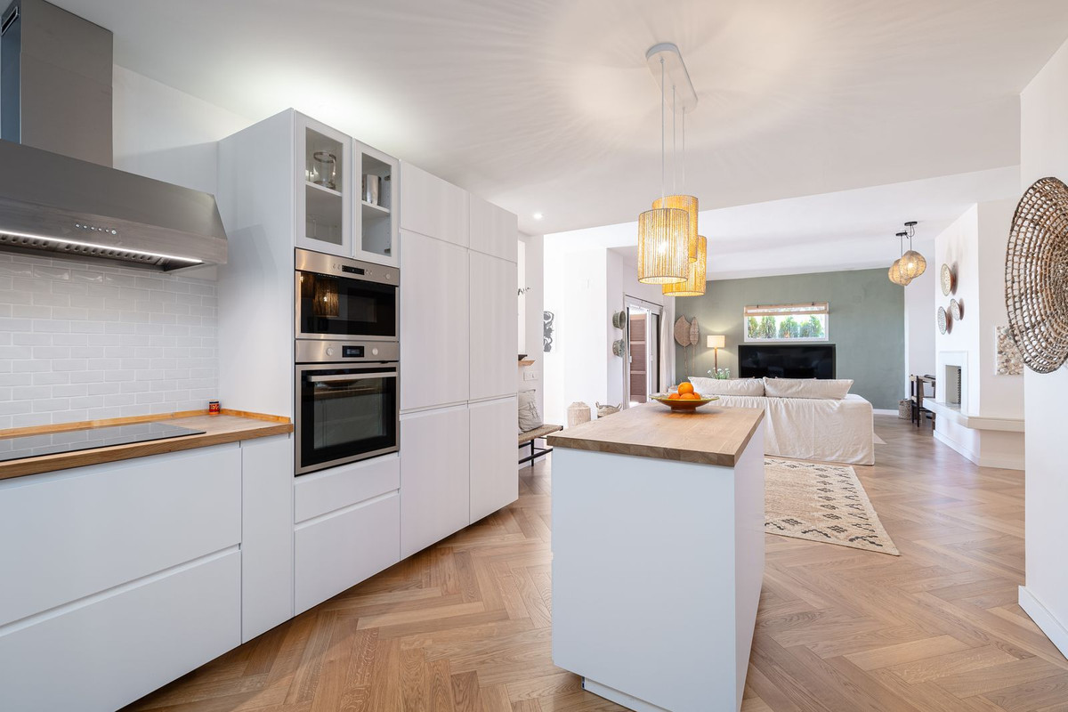 The property offers an interior built area of 215 m² and features three bedrooms, two bathrooms with underfloor heating, and one guest toilet. The layout is well distributed, beginning with a generous entrance hall that ensures privacy from the main living areas. The spacious open-plan living, dining, and kitchen area provides a bright and functional environment with direct access to the terrace.