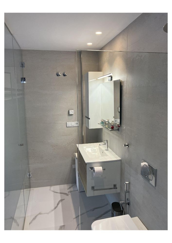 New ground-floor bungalow located in a quiet neighborhood. The property features two bedrooms and two bathrooms, with partially enclosed front and rear terraces. Additional highlights include a summer kitchen, storage room, and a covered garage. Residents also benefit from access to a community swimming pool. Conveniently situated just 2.5 km from the town center.