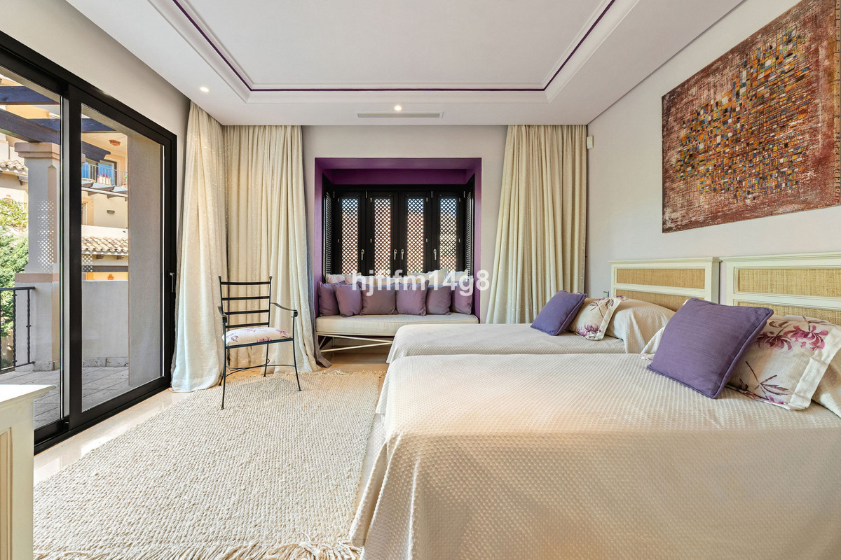Master bedroom är generöst tilltaget, med direkt tillgång till terrassen och ett eget badrum med både hydromassagebadkar och dusch. De två gästrummen har egna terrasser och badrum en suite, medan en gästtoalett ger extra bekvämlighet till bostaden.