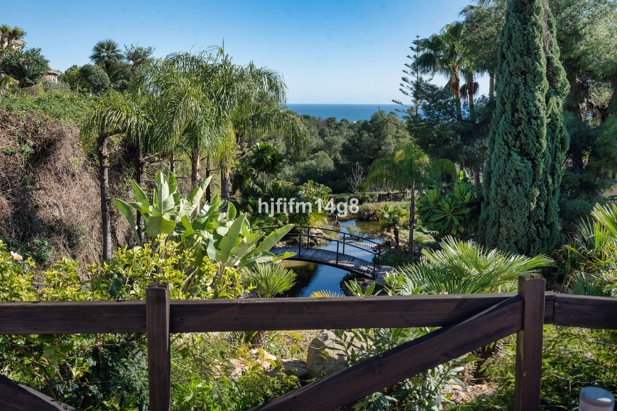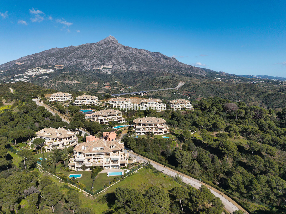 Lägenheten har en rymlig entréhall som leder till det eleganta vardagsrummet och matsalen, vilka inkluderar en mysig öppen spis och direkt tillgång till den stora, omslutande hörnterrassen. Terrassen, som även nås från köket och master bedroom, är perfekt för utomhusunderhållning och avkoppling, och har en privat inbyggd jacuzzi med fantastisk panoramautsikt över de gemensamma trädgårdarna, Medelhavet och La Concha-berget.