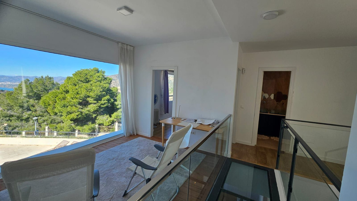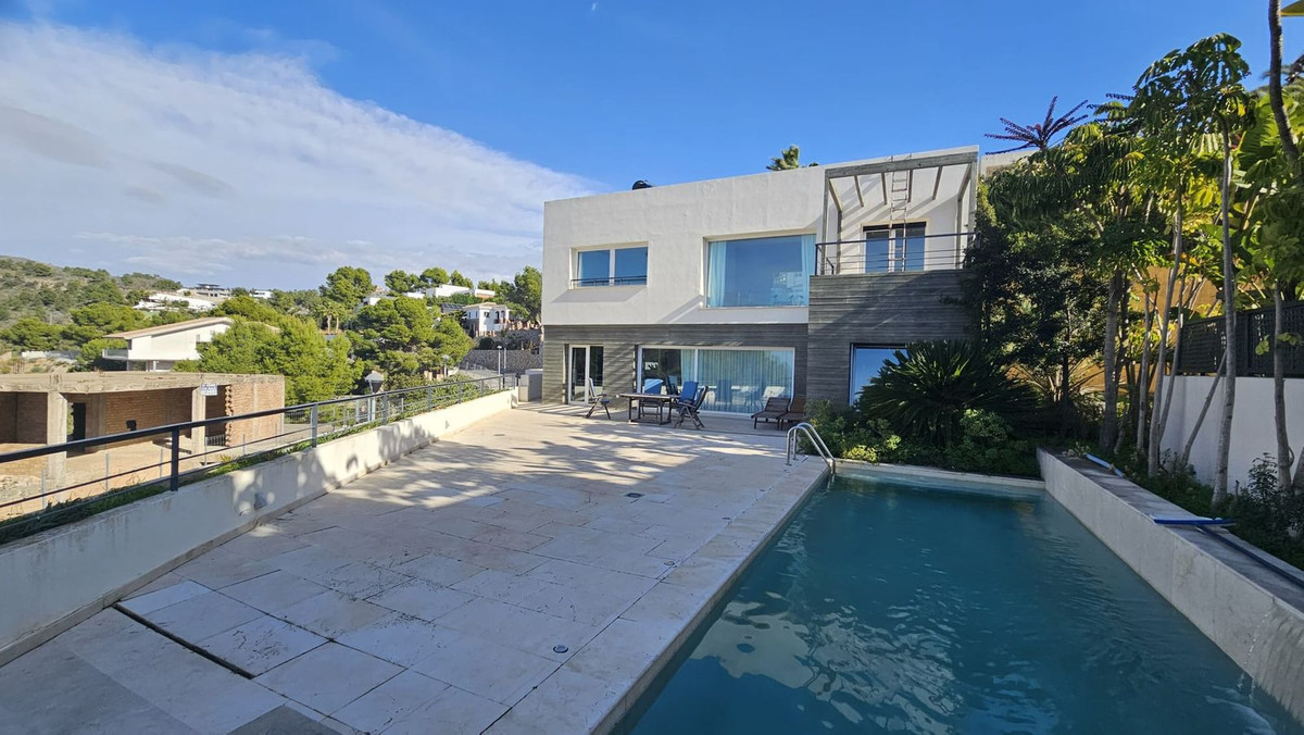 Outside, the villa truly shines. Multiple terraces provide sun-drenched relaxation areas, al fresco dining spaces, and uninterrupted views across the coastline. The private swimming pool is perfectly positioned to enjoy the scenery — an idyllic setting for long summer days.