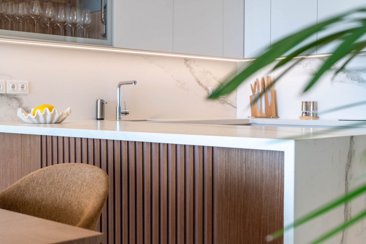 Køkkenet er et fuldt udstyret designerkøkken fra Gunni & Trentino med højkvalitetsapparater og moderne skabselementer, der er designet til både daglig brug og underholdning. Rene arkitektoniske linjer og integrerede finish forstærker boligens æstetiske konsistens.
