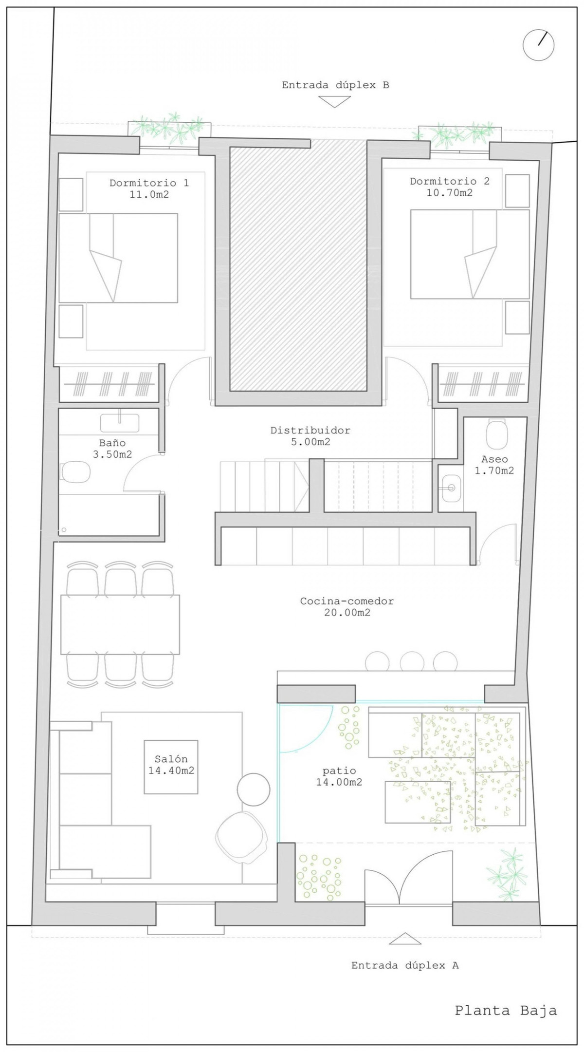 The ground floor features a spacious open-plan living, dining, and kitchen area, which opens onto a charming 14 m² interior patio that provides abundant natural light and ventilation. This level also includes two bedrooms, a full bathroom, and a guest toilet.