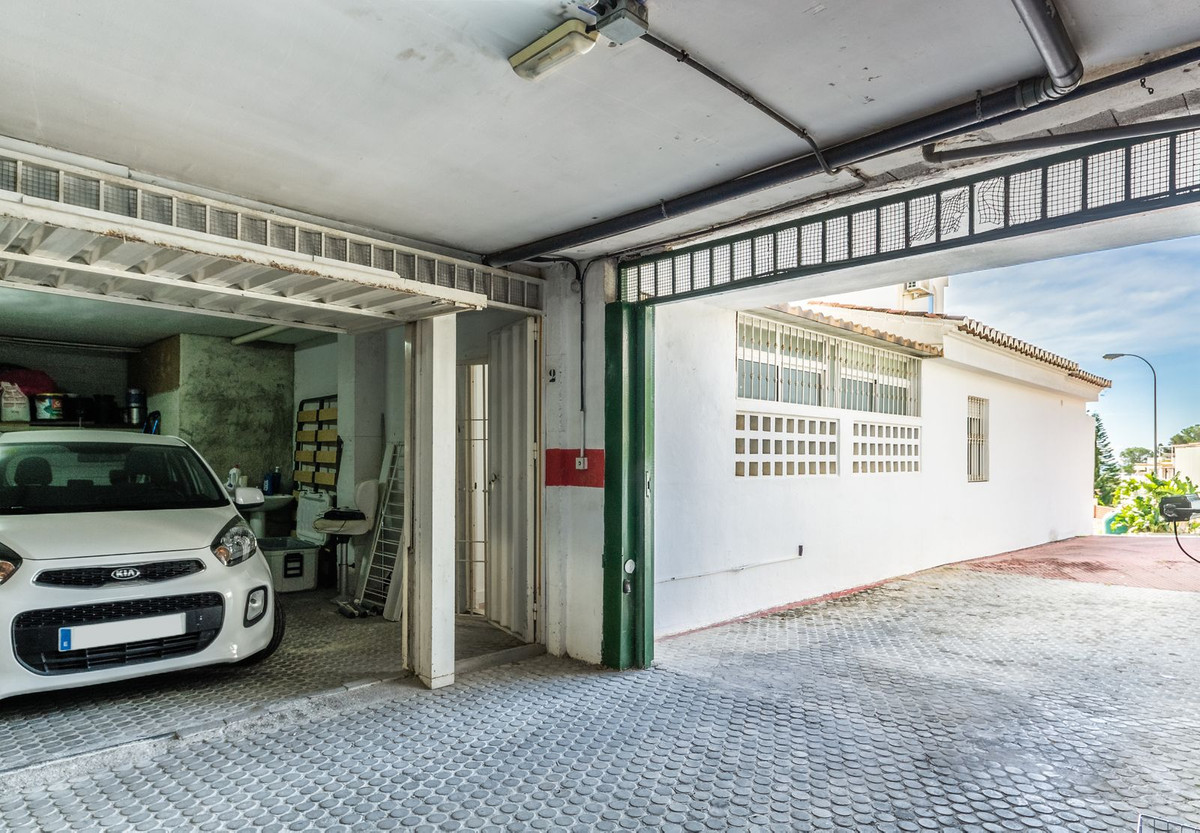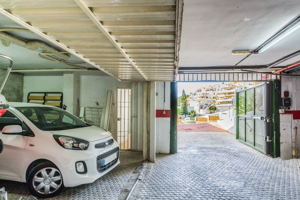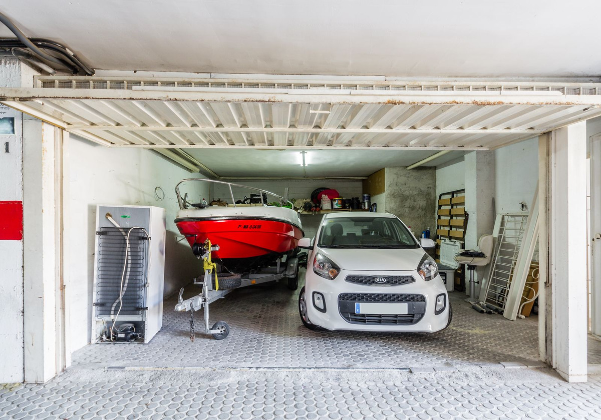 En av de stora fördelarna med denna bostad är det stora stängda dubbelgaraget med direkt tillgång till lägenheten. Mycket praktiskt när man kommer hem med matvaror, resväskor eller paket. Dessutom ingår ett stort förråd som erbjuder utmärkt extra förvaringsutrymme.