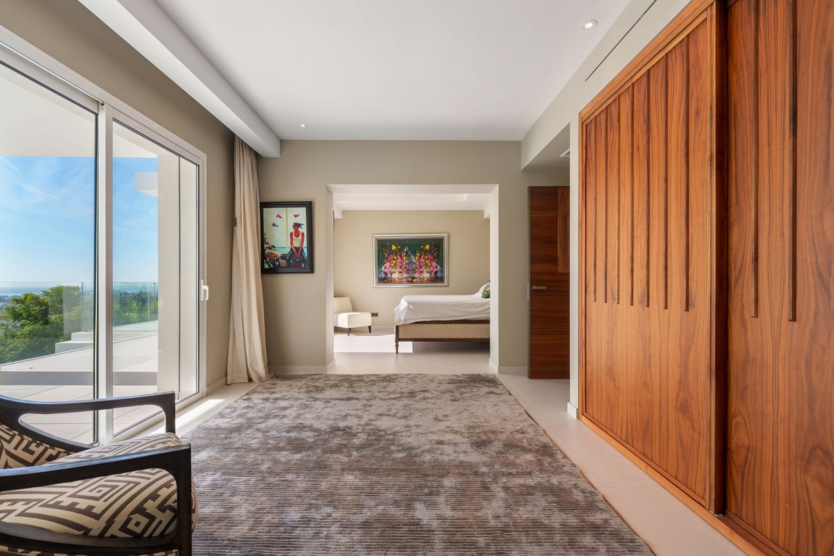 A south-facing villa in Puerto del Almendro, Benahavís with nine bedrooms and nine en-suite bathrooms, arranged across a main residence and an independent guest house on a 7,881 m² plot, offering approximately 1,177 m² of built space, 140 m² of terraces, two outdoor swimming pools, and far-reaching sea and mountain views across the Mediterranean coastline.
