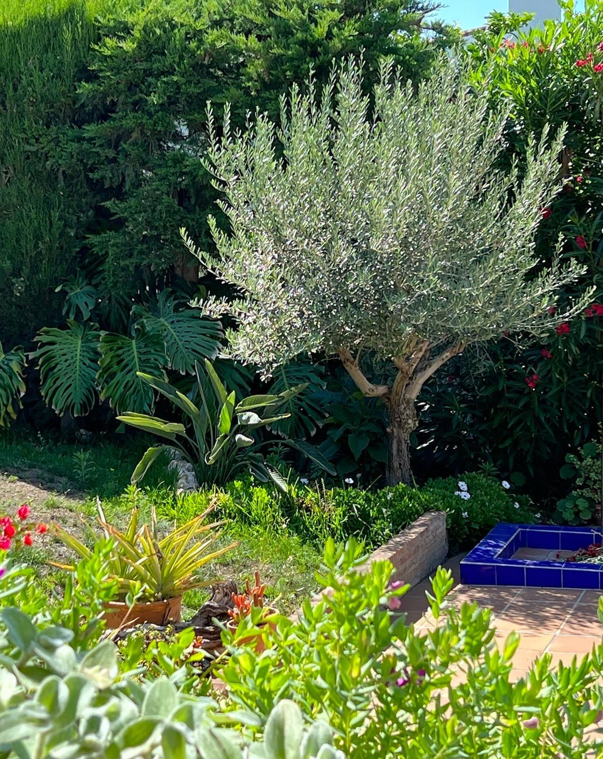 Huset välkomnar sina besökare via en liten patio inspirerad av Córdoba, med ett vackert golv dekorerat med en stjärna av vita och grå stenar. Denna hörna, omgiven av grönska, rymmer bananplantor som ger frukt på vintern, kaffeplantor och andra prydnadsväxter som tillför friskhet och karaktär. Här finns också ett praktiskt förråd för trädgårdsredskap samt en tvättstuga.