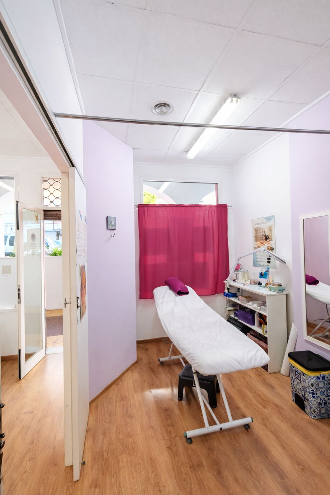 The property is very bright and has a practical layout. It features one treatment room divided into two working areas, ideal for beauty or wellness services, as well as a bathroom and a small storage room/closet for supplies.