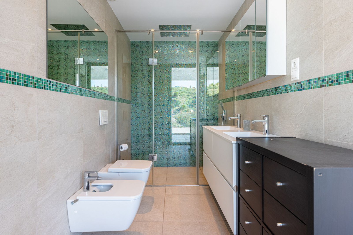 Det övre planet är villans hjärta, skapat för att maximera ljuset och den storslagna utsikten. Här finns ett imponerande vardagsrum med generös takhöjd och ett magiskt ljusinsläpp, ett modernt öppet kök som flyter samman med matsalsdelen och en stor terrass där du kan njuta av panoramavyn och oförglömliga solnedgångar. På denna våning finns även en gästtoalett samt en trappa som leder upp till takterrassen, där solpanelerna är placerade.