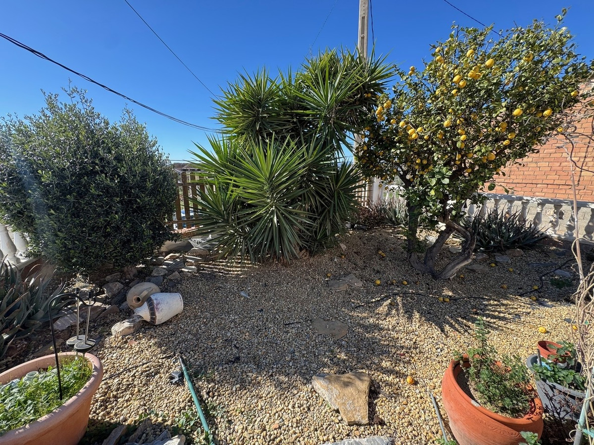 The garden is well established, with mature planting that includes palm trees, lemon trees, and olive trees, creating a serene and attractive outdoor space ideal for relaxing or entertaining.