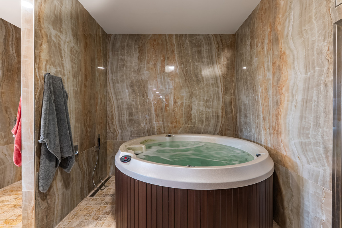 The villa is defined by its exceptional use of premium natural materials. Large-format marble and onyx surfaces create a distinctive and luxurious aesthetic throughout the property.