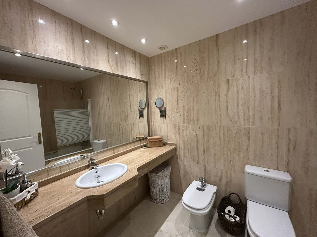 Elegant and bright west facing apartment situated in Santa Maria Village, a gated 24hour security community nested in Elviria, only minutes away from Marbella's nicest sandy beaches. This immaculate apartment combines comfort, style and convenience and features an ample open plan living & dining room with a modern fully fitted kitchen. From the living room and master bedroom you exit out onto the large covered terrace with views to the pool, communal gardens and surroundings. This is a quiet and well kept community with landscaped gardens, 4 large swimming pools, children's pools and is just a 5 minute drive from 2 commercial centers with shops, supermarkets, bars, restaurants and other amenities, making it the perfect blend of comfort and accessibility. The property also features A/C hot & cold, laundry room, a private dedicated parking space & storage room. The perfect holiday home or permanent residence for those seeking tranquility without sacrificing amenities and security.