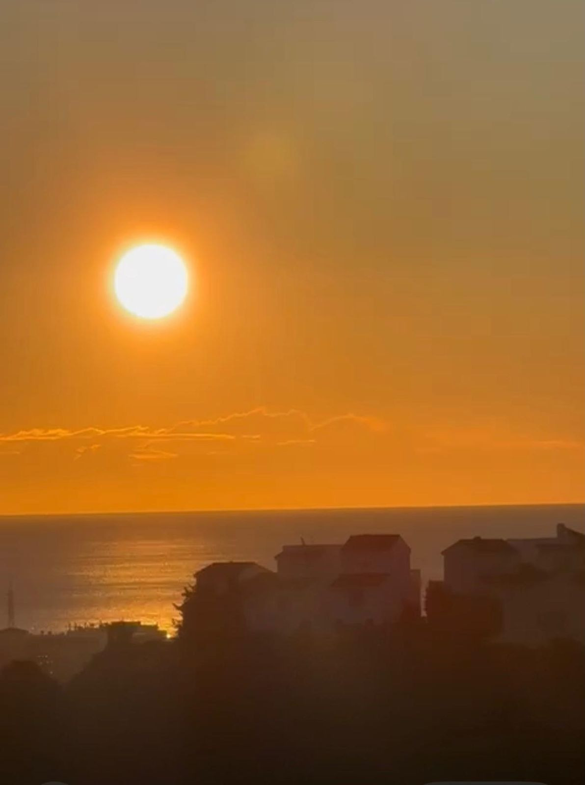 The main floor features a welcoming entrance hall, an independent kitchen, a bathroom with shower, and a spacious living room with fireplace and access to a sunny terrace with breathtaking coastal and mountain views