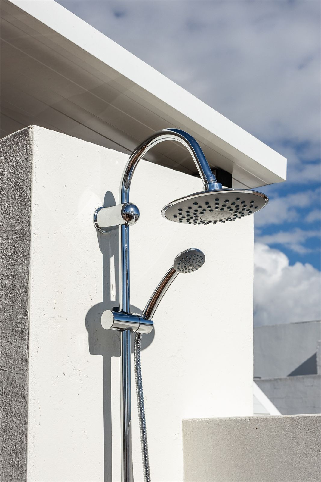 Totalt har du tillgång till närmare 100 kvm terrassyta, inklusive en generös takterrass som nås via en intern trappa. En del av takterrassen är inbyggd och förses med glaspartier som skapar en ljus och vindskyddad miljö, perfekt för både avkoppling och sociala tillställningar. Här finns dessutom en utedusch med varm och kallvatten samt en praktisk tvättstuga. Fri utsikt över omgivningarna och glimtar av havet gör detta till en idealisk plats för att njuta av solen, skapa ett eget utekök eller inreda en loungedel.