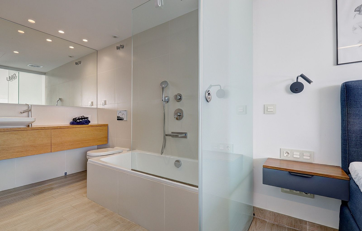 Denna moderna lägenhet, belägen i det eftertraktade bostadsområdet El Higueron, erbjuder fantastisk havsutsikt från både vardagsrummet och huvudrummet. Perfekt placerad på gångavstånd till stranden, tågstationen, ett närliggande 5-stjärnigt hotell och olika bekvämligheter, har bostaden ett utmärkt läge. Det öppna vardagsrummet och matsalen har ett fullt utrustat kök med BOSCH-apparater och öppnar upp till en rymlig terrass. Huvudrummet har ett eget badrum och spektakulär havsutsikt. Det finns även ett andra sovrum, ett extra badrum och en separat tvättstuga för extra bekvämlighet. Lägenheten har två parkeringsplatser under markplan och ett förråd. Boende kan njuta av gemensamma faciliteter, inklusive två infinitypooler, en coworking-yta och säkerhet dygnet runt. Dessutom har invånarna tillgång till bekvämligheterna på det intilliggande 5-stjärniga hotellet, som erbjuder ett spa, gym, padel- och tennisbanor, samt ett urval av restauranger och barer. Med sitt fantastiska läge, moderna design och tillgång till exceptionella faciliteter är denna bostad det perfekta valet för en andra bostad eller semesterhem på Costa del Sol.