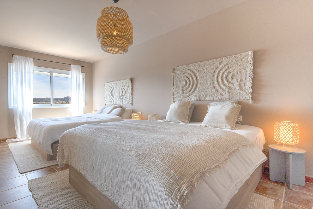 Two large bedrooms, each with two double beds, as well as two bathrooms. There is also a cozy living room and a kitchen on this floor. Direct access to a covered terrace and a large private pool area with sun loungers and fantastic views.