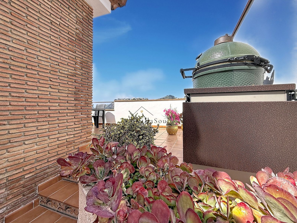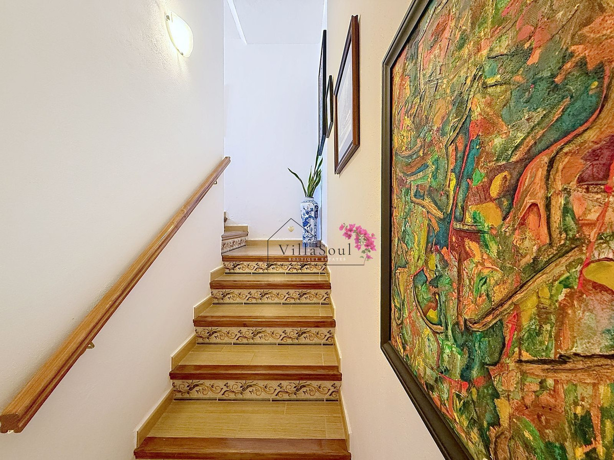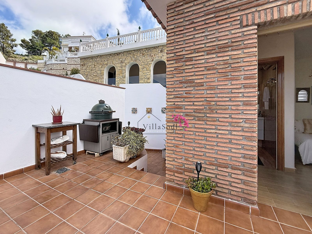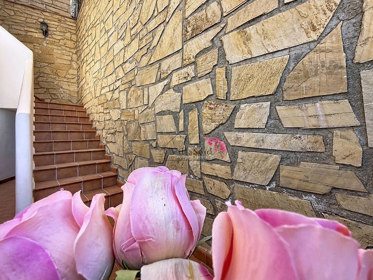 Above, an additional room with its own bathroom offers flexibility as a third bedroom, office or guest suite, connected to a charming terrace and barbecue area. The outdoor spaces are spread across different levels, offering a variety of settings from intimate corners to open sunlit terraces.