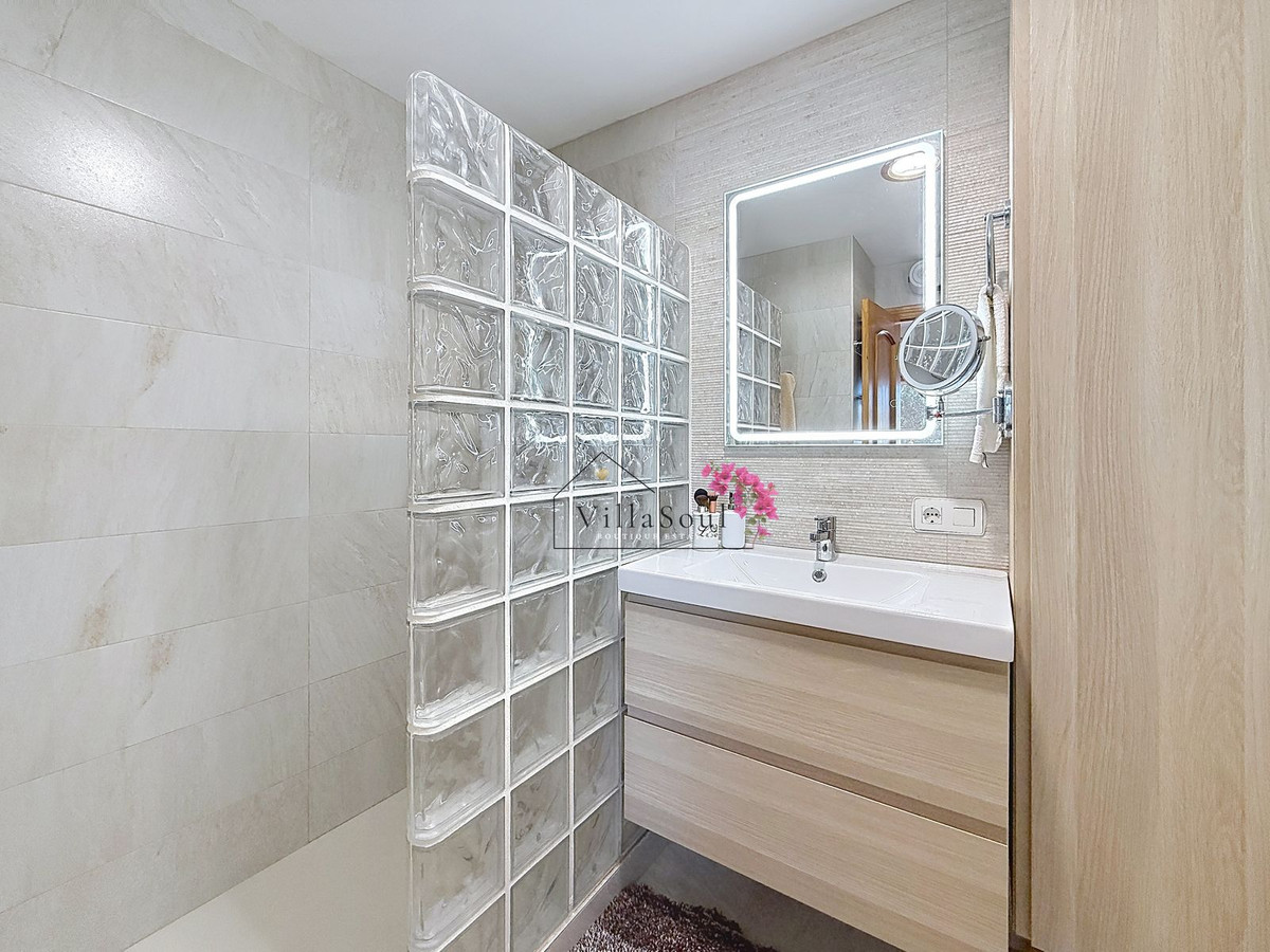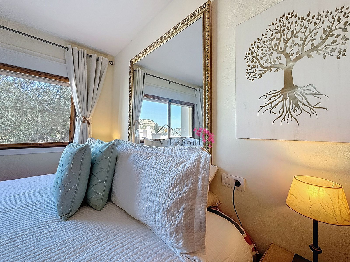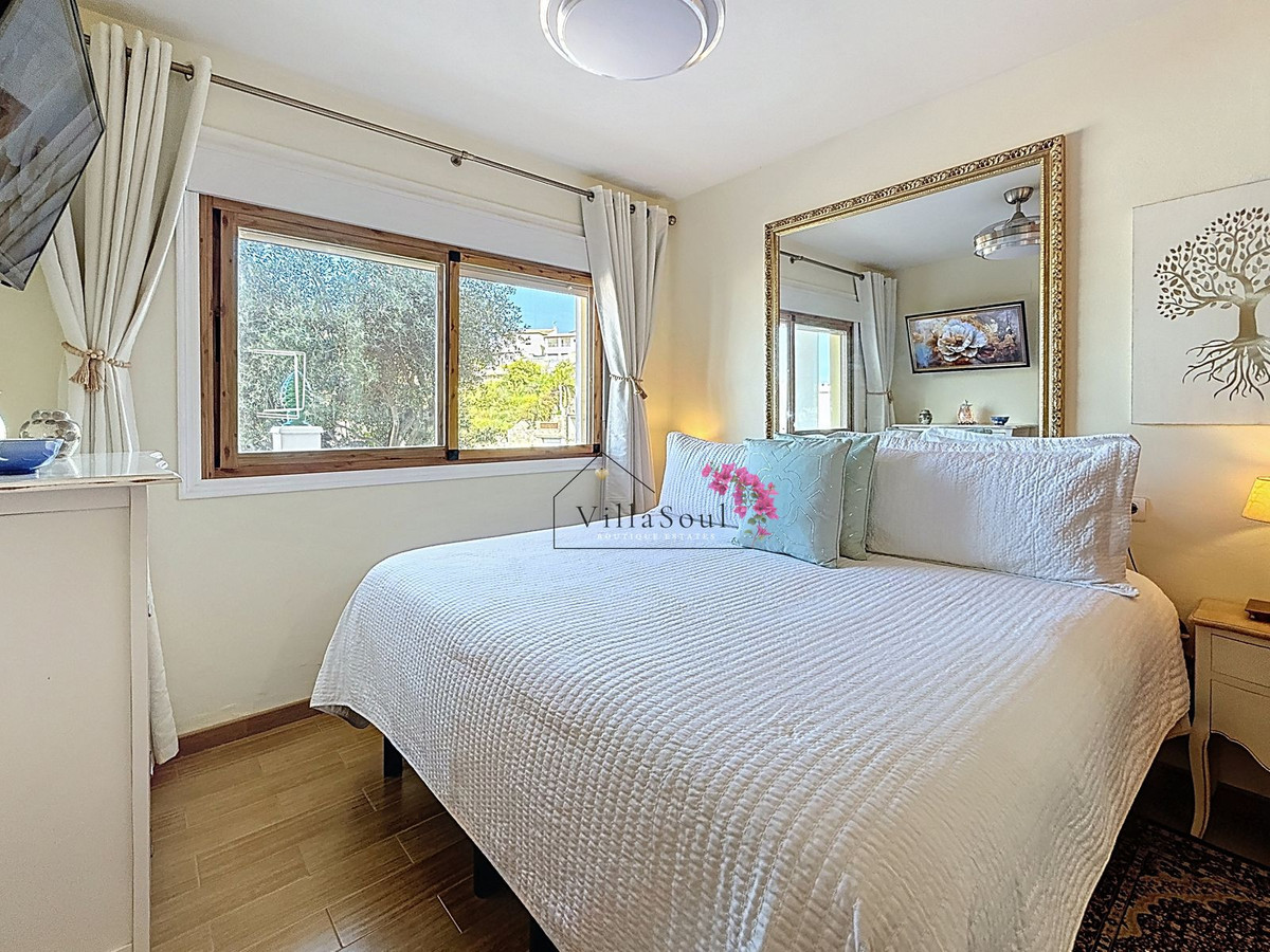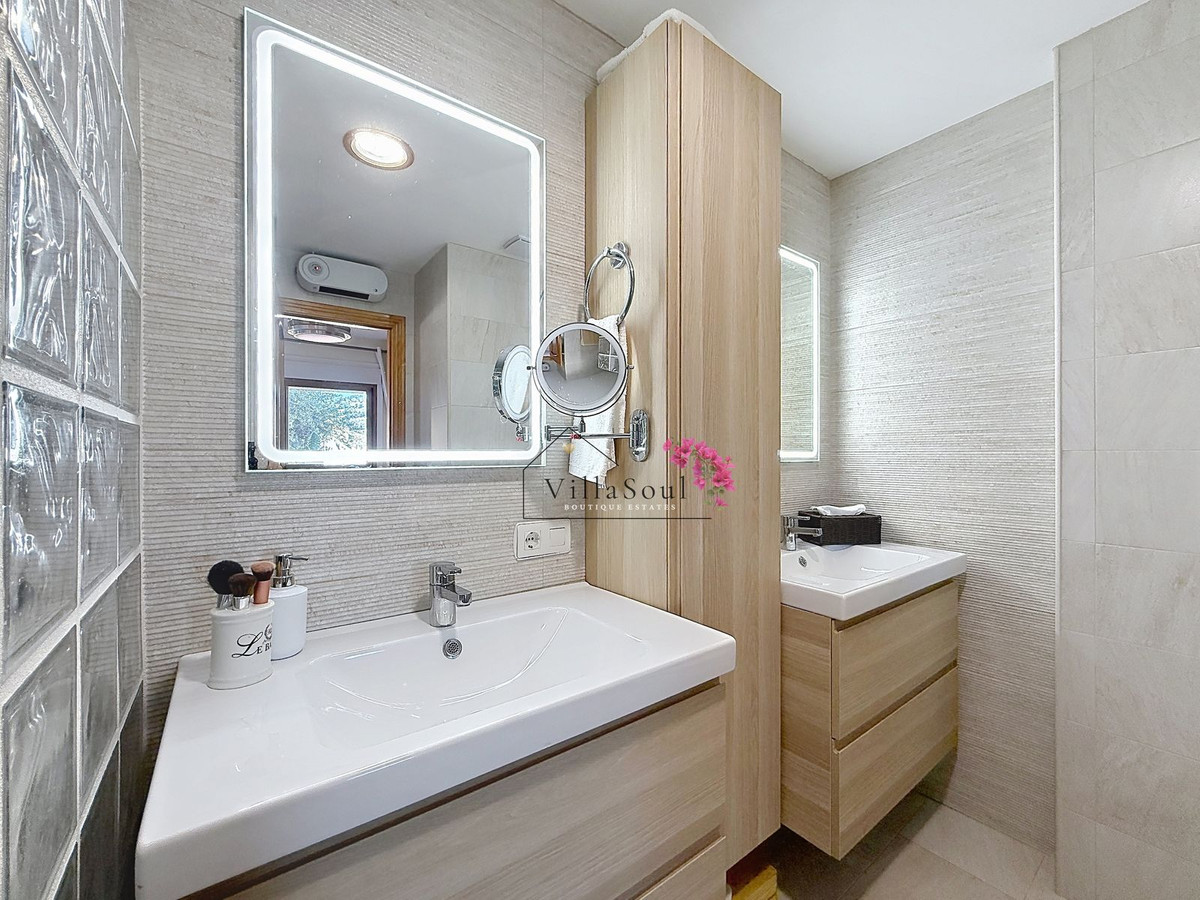 On the first level, two spacious bedrooms each feature their own en-suite bathroom, creating a refined and private sleeping area. One level higher, the main living space unfolds into a bright and elegant environment, with a beautiful open kitchen fitted with Bosch appliances, a guest toilet, and direct access to a terrace with stunning sea views. Light, space and atmosphere come together here in a natural and effortless way.