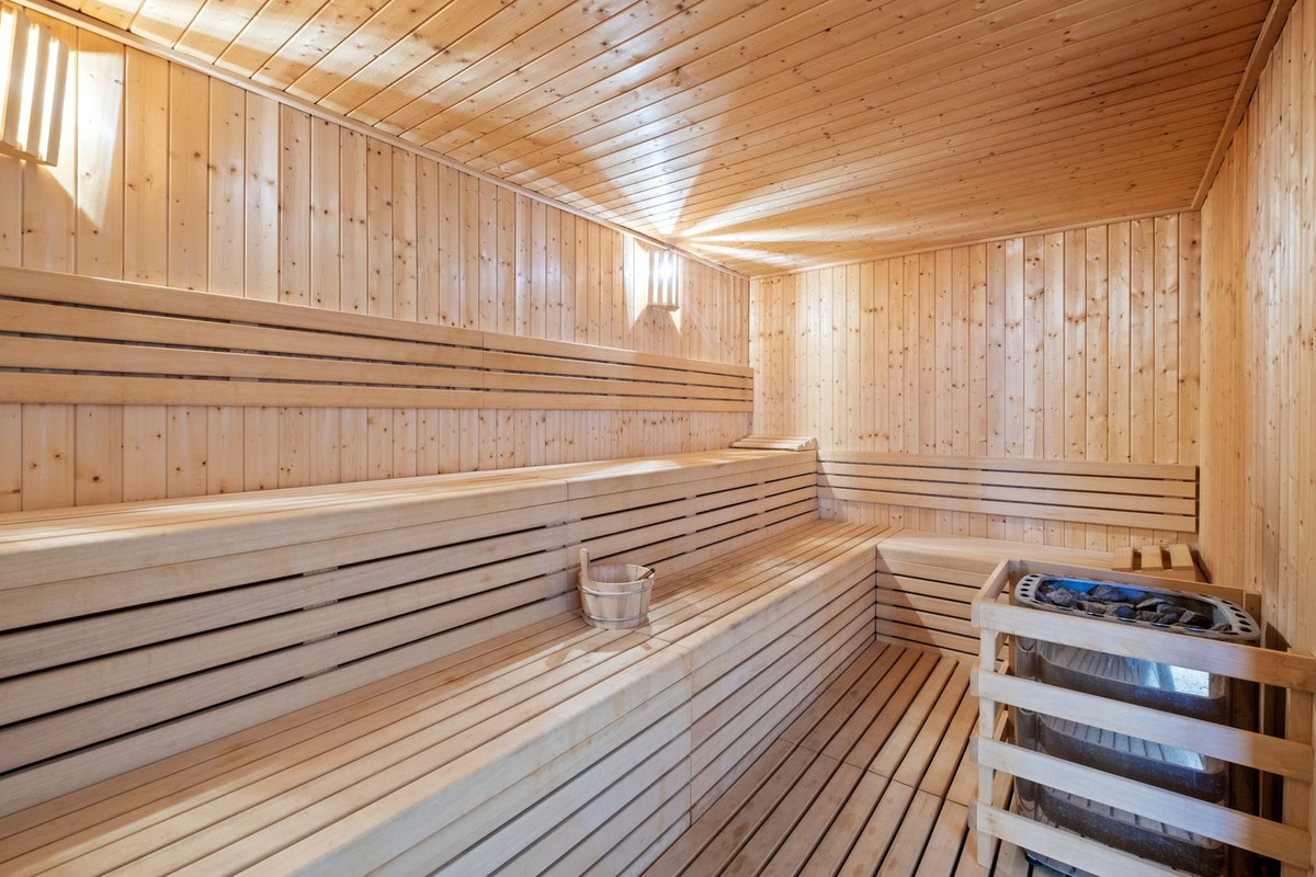 Residents benefit from excellent communal facilities, including an outdoor swimming pool, indoor pool, fully equipped gym, sauna, and a relaxing turquoise bath area.