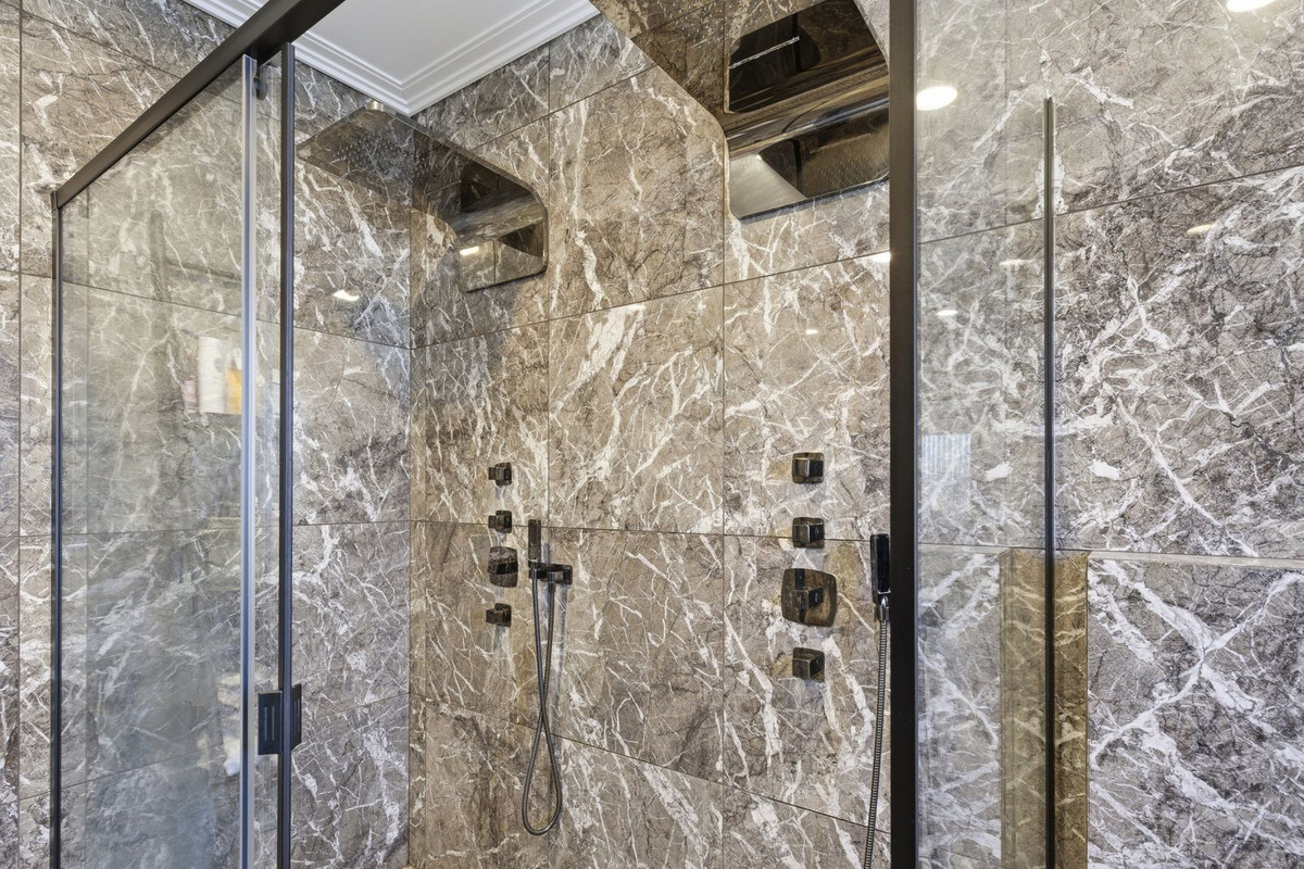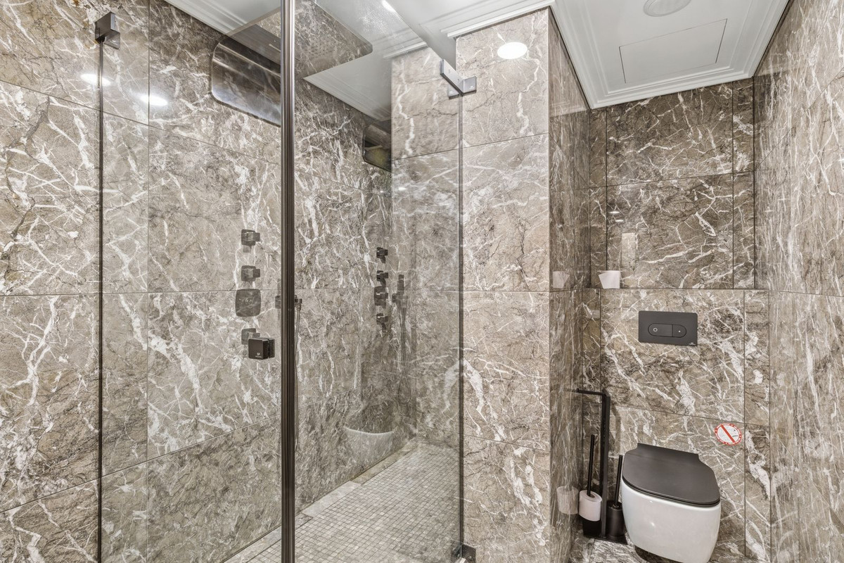 The open-plan living area is flooded with natural light through floor-to-ceiling windows and features a statement fireplace and a spectacular custom-designed luxury kitchen. Every detail has been carefully selected to create a seamless blend of elegance and functionality.