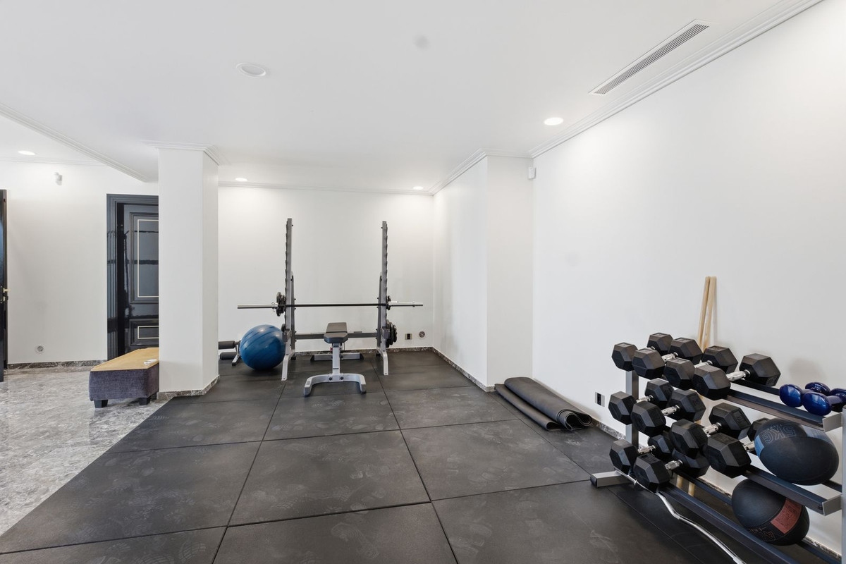 The impressive underbuild of **187 m²** offers incredible additional space, including a fully equipped private gym, a large guest bedroom, and direct access to a spacious garage with room for two cars and ample storage.