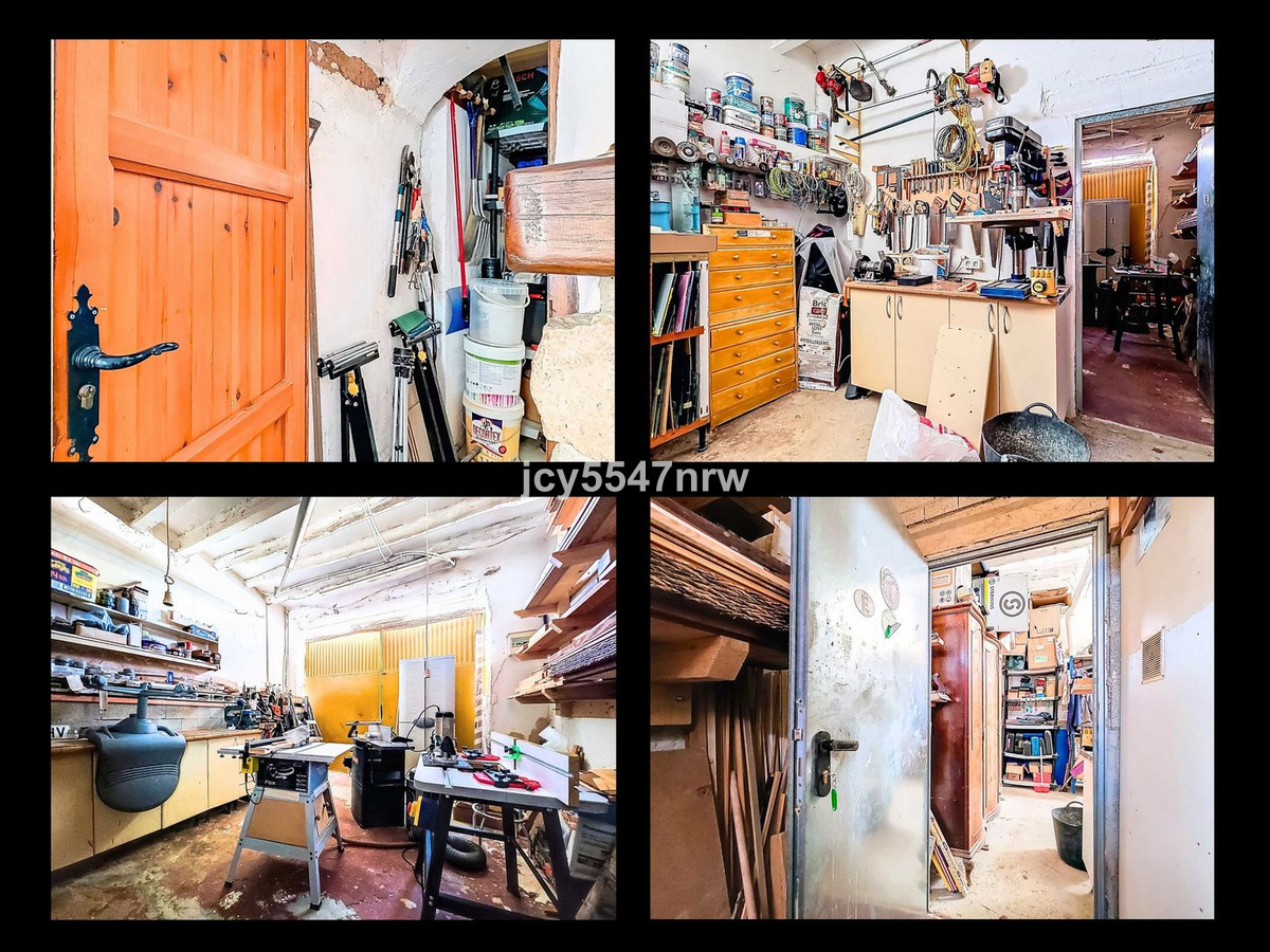 On the ground floor, two bedrooms are located on either side of the large entrance hall. Through double doors, you enter a cosy living room that leads to a very spacious garage. This garage can easily be used as a workshop or studio and, with minor adjustments, could also serve as a perfect home office. The living room also provides access to the upper floor, and there is a convenient storage area under the stairs.