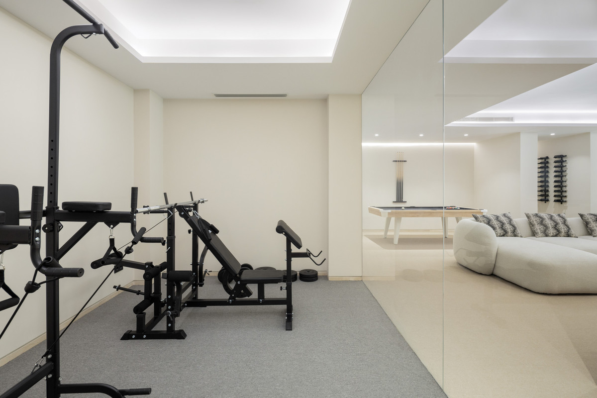 Den lägre nivån är utformad för fritid och funktionalitet, med ett fullt utrustat gym, en skräddarsydd bodega, ett andra vardagsrum och ett extra kök med barområde. Denna nivå inkluderar också två en-suite gäst sovrum, både med direkt tillgång till en sekundär pool område och anlagda trädgårdar, skapa en privat reträtt för gäster. En tre-bil garage och gäst toalett komplett denna våning.