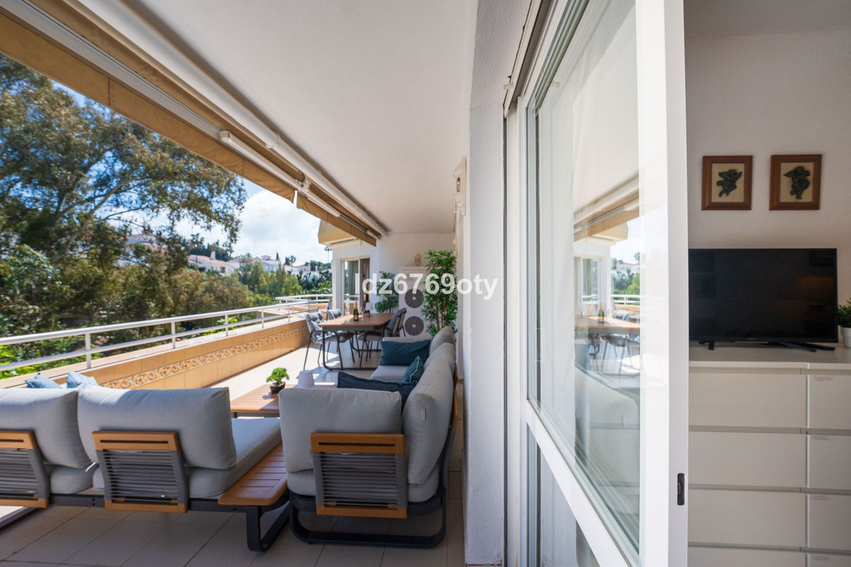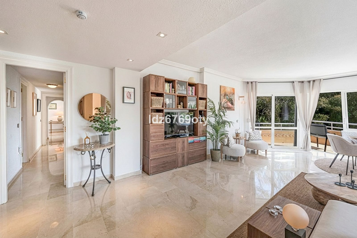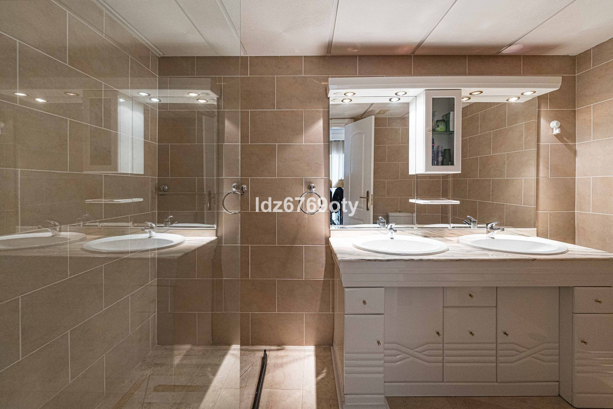A spacious and very well-maintained luxury apartment in a prime location next to the popular Torrequebrada Golf Course in Benalmádena Costa! This spacious and light-filled corner apartment is situated in the beautifully maintained small-scale ‘Palmeras del Golf' urbanisation, featuring numerous palm trees and gardens and boasting two swimming pools. The 3-bedroom apartment features a large master bedroom with an en-suite bathroom with double sinks and built-in cupboards, a bath and a toilet. The other two spacious bedrooms share a second bathroom, which also features double sinks and built-in cupboards, a large walk-in shower and a toilet. All bedrooms are fitted with spacious built-in wardrobes and air conditioning units for both cooling and heating.
