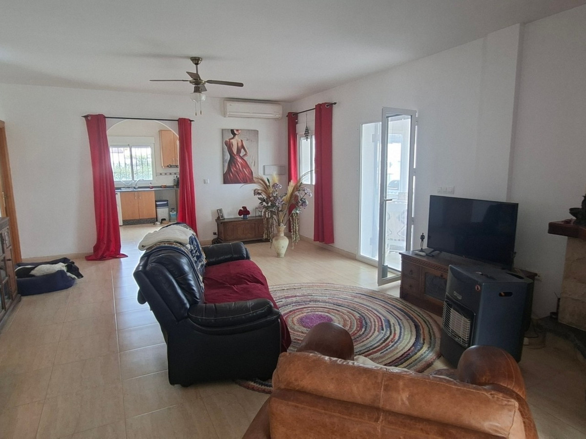 The villa offers approximately 130m² of built area including the sun lounge and sits on a generous, fully walled and gated plot of around 1,200m². Upon entering the property, you are welcomed into a spacious kitchen fitted with modern appliances and offering ample storage and worktop space. From the kitchen you step into a very large and bright lounge, which features a wood-burning fireplace and provides a comfortable and inviting living area.
