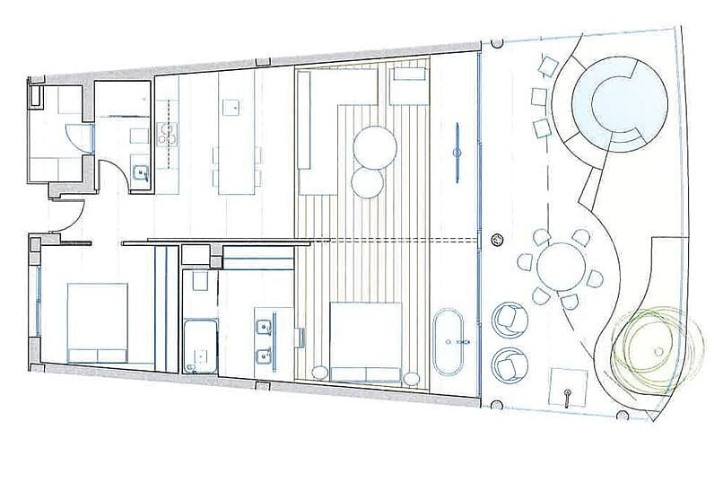 Lägenheten utmärker sig med sin moderna loftdesign som betonar rymd, ljus och flexibilitet. Det öppna köket är fullt utrustat med högkvalitativa vitvaror och ansluter sömlöst till vardagsrummet, vilket skapar en ljus och social atmosfär. Huvudsovrummet har ett öppet badrum med dusch, medan toaletten är separat för extra komfort. En skjutvägg gör det möjligt att öppna sovrummet mot vardagsrummet och skapar en flexibel planlösning. Stora fönster leder ut till en rymlig terrass på 49 m² med vacker utsikt över dalen och havet, vilket förlänger bostadsytan utomhus och fyller interiören med naturligt ljus. Terrassen har även en privat jacuzzi, perfekt för avkoppling med utsikt. Lägenheten inkluderar också två parkeringsplatser och ett förråd, vilket ökar funktionaliteten i den moderna designen.